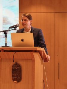 Anschließend ergriff László Bódis, stellvertretender Staatssekretär des Ministeriums für Kultur und Innovation Ungarns, das Wort. Er sprach über die strategische Rolle der Wissenschaft im kulturellen Austausch und würdigte die Lebensleistung von Dennis Gabor als Symbol für die Verbindung von Kreativität und Innovation.